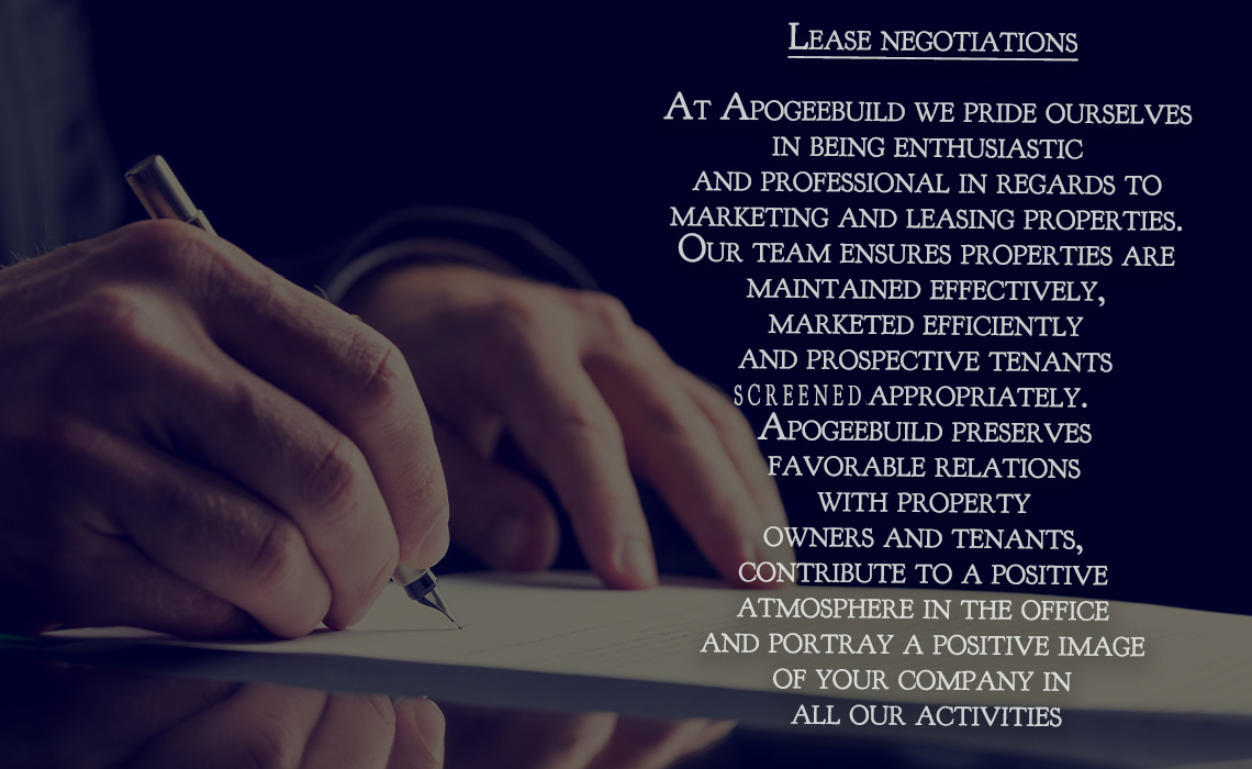 ApogeeBuild is responsible for the direct management oversight of assigned commercial / residential properties. Our goal is to maximize asset value, customer satisfaction and revenue. Some of our direct responsibilities include: Designing business plans for assigned properties, property inspections, scheduling and supervising maintenance, lease negotiations, and overseeing the properties personnel and personnel performance.