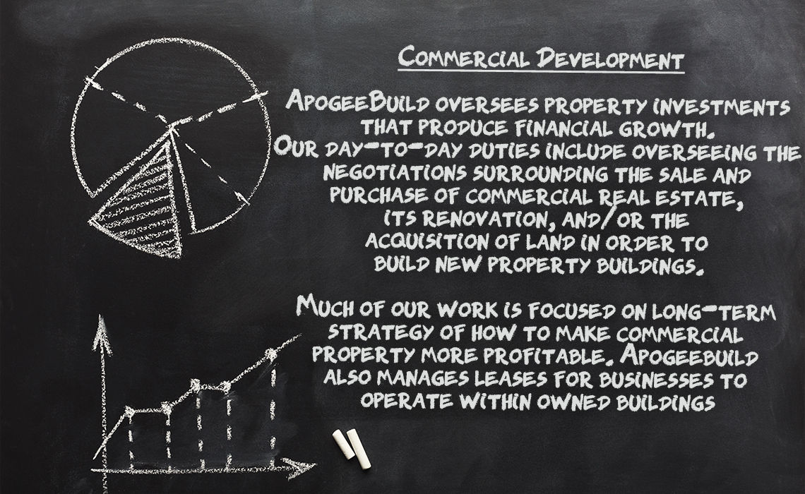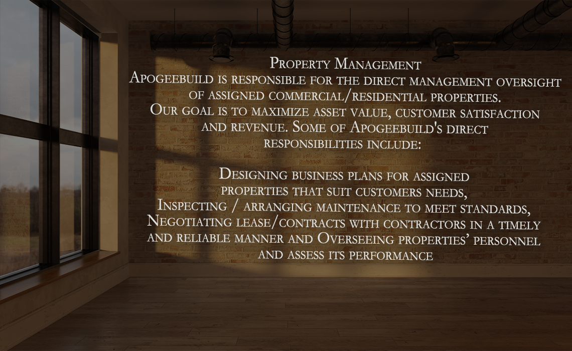 ApogeeBuild is responsible for the direct management oversight of assigned commercial / residential properties. Our goal is to maximize asset value, customer satisfaction and revenue. Some of our direct responsibilities include: Designing business plans for assigned properties, property inspections, scheduling and supervising maintenance, lease negotiations, and overseeing the properties personnel and personnel performance.
